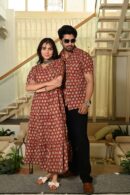 Traditional yet trendy red cotton couple wear featuring shimmering gold leaf block prints. The flowy women?s dress pairs beautifully with the men?s casual shirt, making it a stunning choice for festive occasions or casual gatherings.